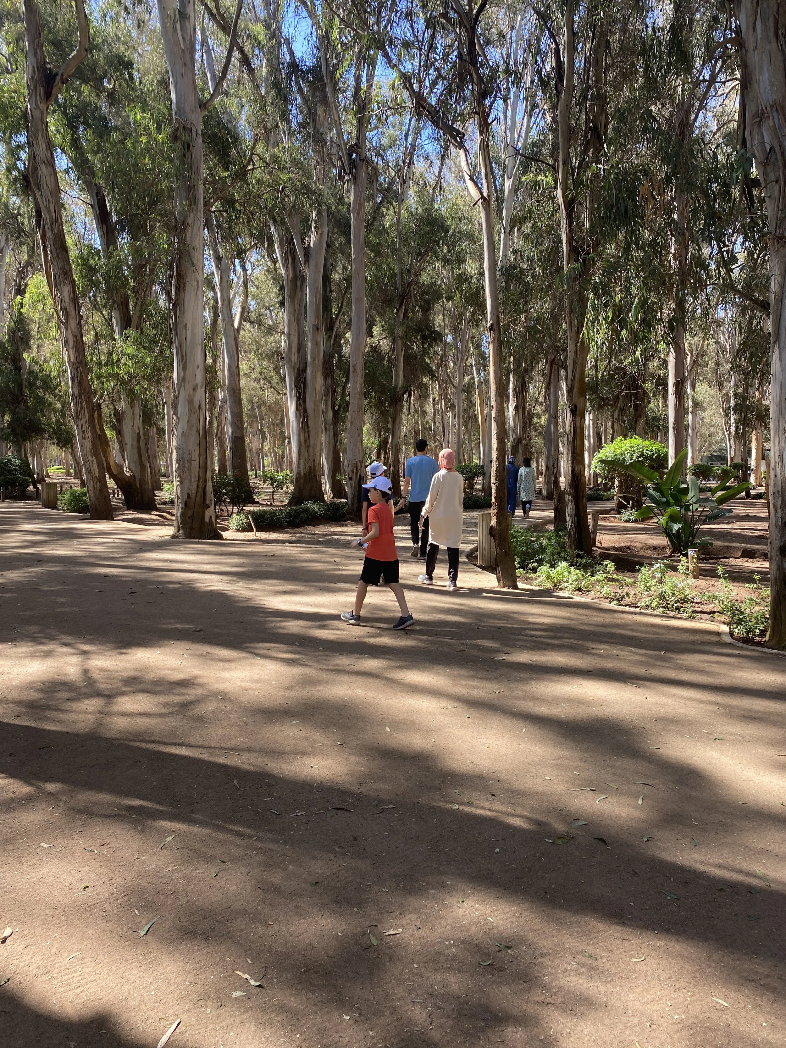 ‘Hilton’ park is in the Agdal neighborhood of Rabat. I go here several times a week to walk or run, and there are always many people doing yoga, kickboxing, and exercising in many different ways– but also there are many families and friends there to simply spend time together. It is a beautiful park, with a 1.8-mile loop around its circumference for walking or running. The park looks like a forest with all of its trees, but the ground and loop are more like clay dirt. Along this loop there are several stations with outdoor gym equipment, like hanging bars, slanted platforms for core exercises, and non-motorized ellipticals. Most of the trees in the forest are actually eucalyptus, which makes breathing the air even more suitable and helpful while moving your body. In the center of the park there are wandering paths and benches for hanging out or having quiet time to yourself, ping pong tables, a skate park, a little ‘lac’ (lake– but it is more like a pond) with a fountain, and many picnic tables for picnicking. Across the street the park continues with basketball and soccer courts. There are several entrances on each side of the park, but the main entrance is by the Sofitel hotel. The park closes at 8pm, as do most parks in Rabat, so be careful not to be locked in! But there are men on motor scooters who go around the park to let park goers know when the gates are about to close. On the outside of the gates, at the main entrance however, a grassier park with pathways, benches, and trees continues, in case you want to hang out there too.