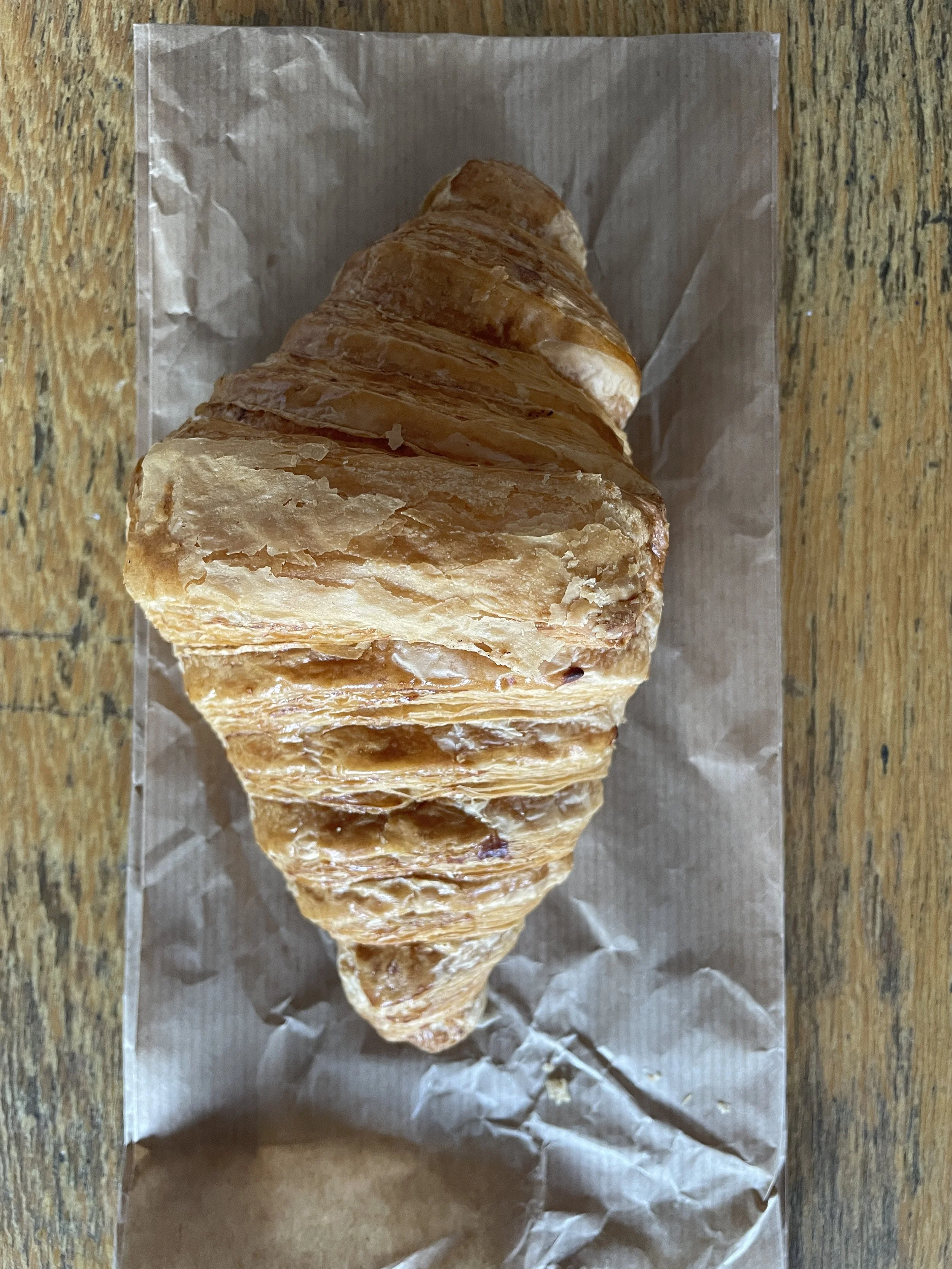 This croissant was flaky bzaf. Far too flaky. The flake gave it a dry, crunchy taste, and there was too much air at either end of the pastry.