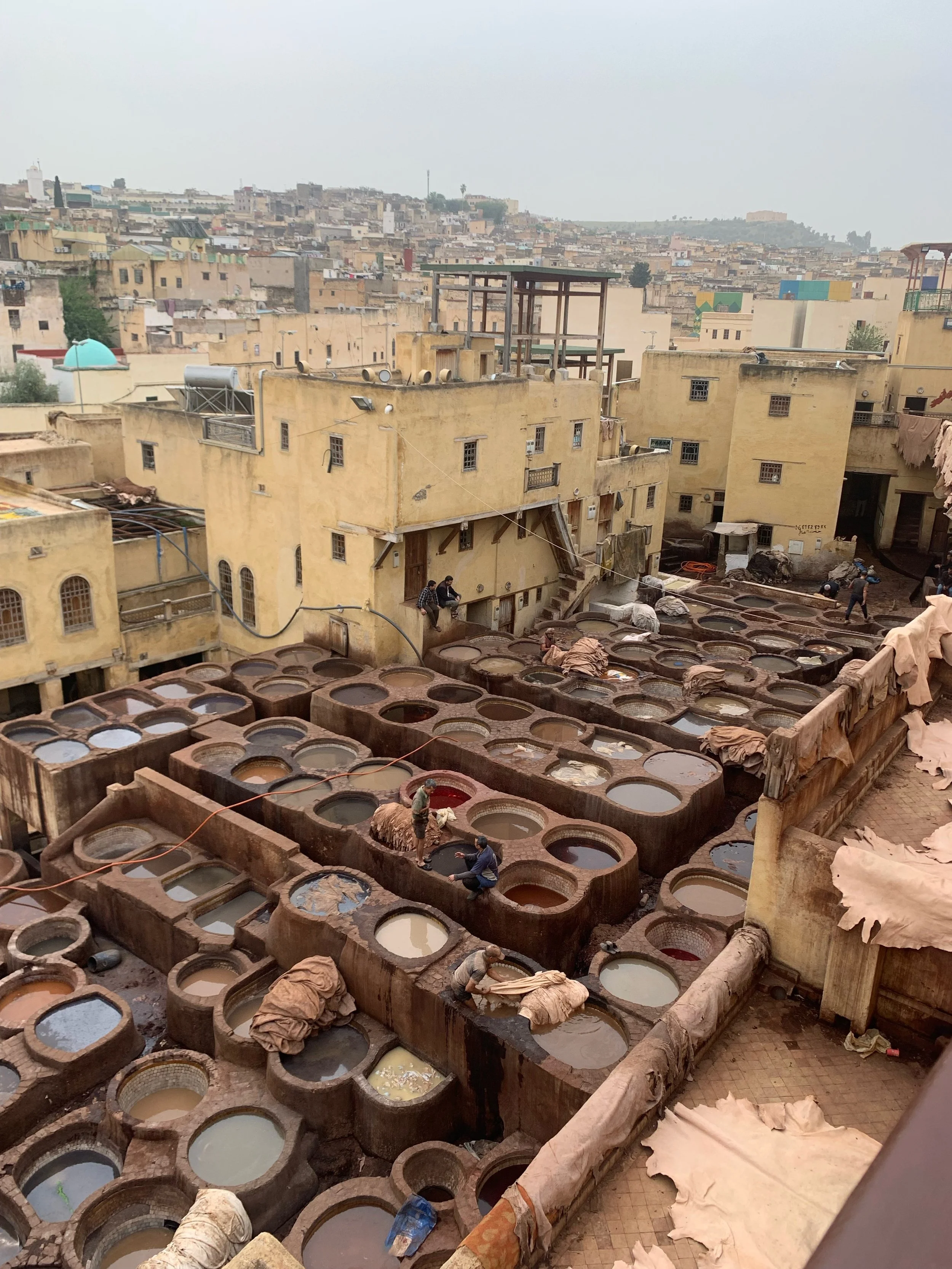 These are the famous tanneries in Fes where leather is processed, dyed, and crafted into high quality goods.