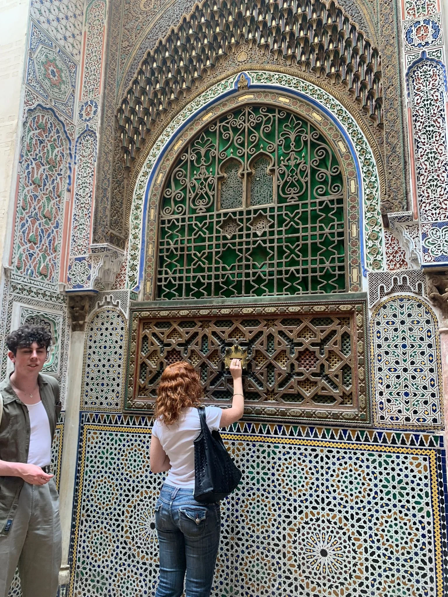 In the Medina, this tile piece is said to grant wishes if you place your hand on it and put a coin in the little slot. We all lined up to make wishes.