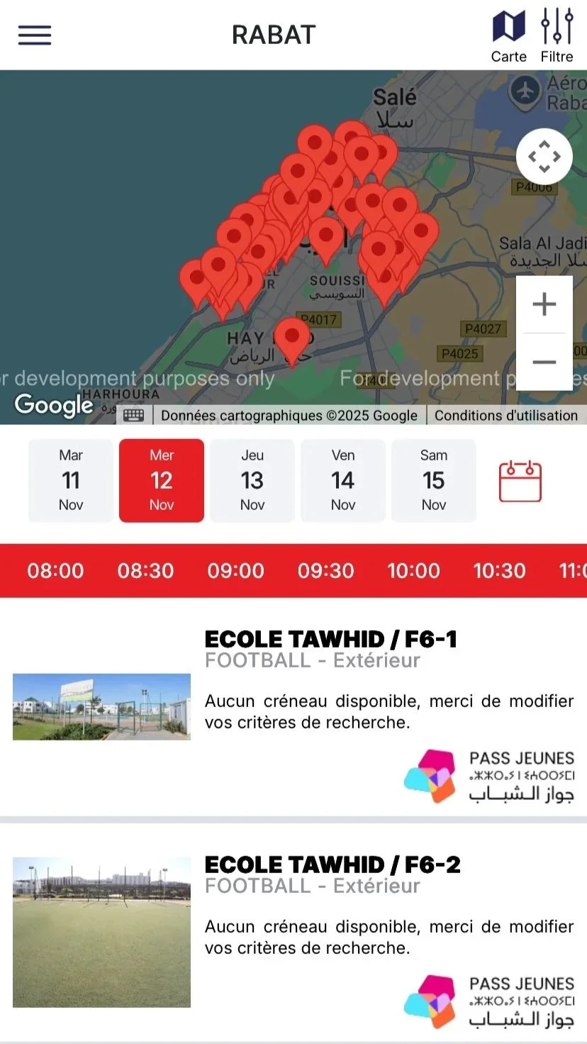 I have also been playing in more organized soccer games around the city. Rabat–Salé has over 30 public outdoor courts that are easy to reserve for a casual match with friends. Using the Rabat Animation app, you can zoom in on the map to choose a court and book it for an hour. It typically costs around 60 dirhams, about 6 U.S. dollars.