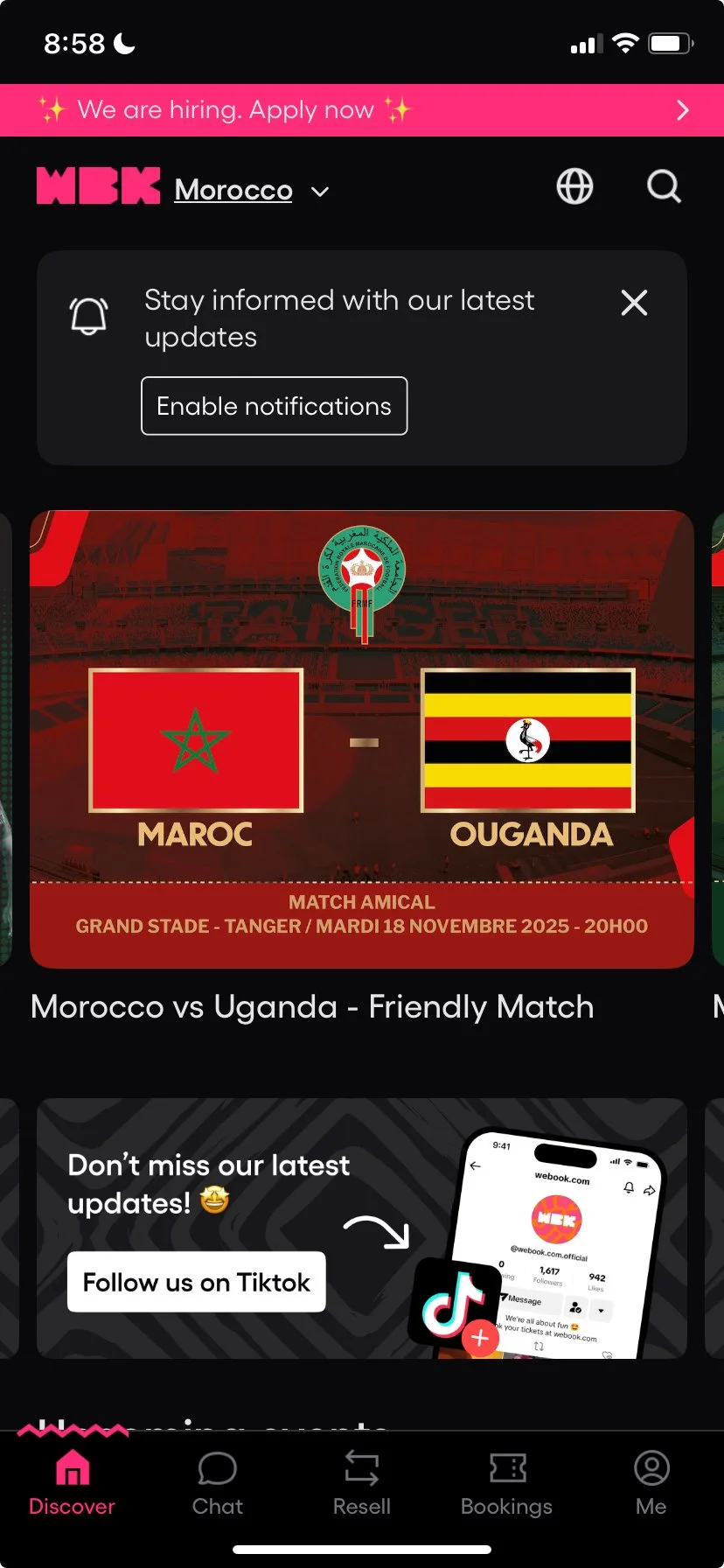Buying tickets for national and club soccer games in Morocco is easy and affordable through an app called WEBOOK. However, unlike in the U.S., game schedules and ticket sales are typically announced only about a week in advance, which can make planning ahead a bit tricky.